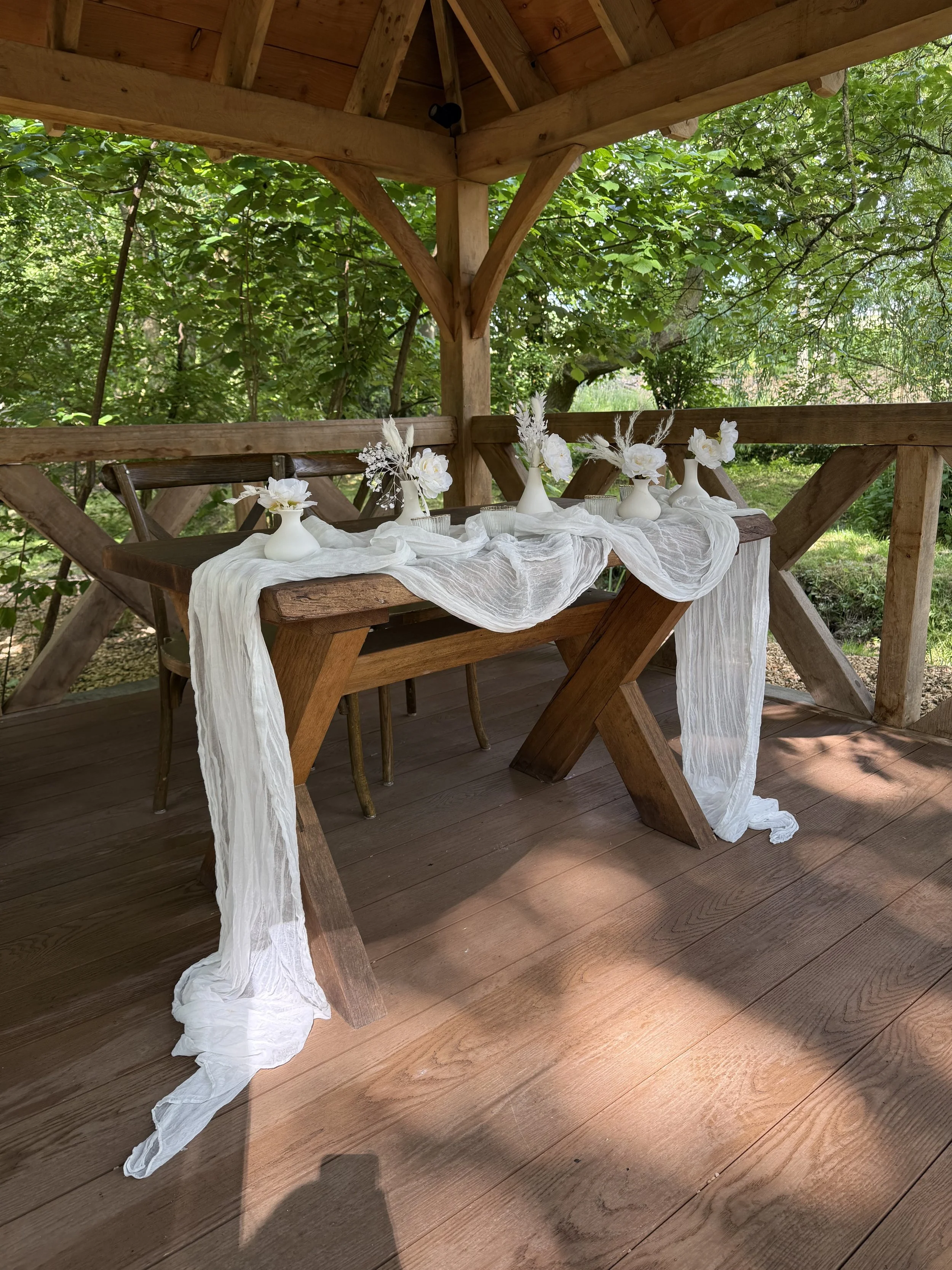 Our runners are a great way of adding a splash of texture and colour to your tables, and a fab base to build your centrepiece on! With lots of different colours available in chiffon and gauze, we will dress your tables with gorgeous table runners to coordinate with your theme!